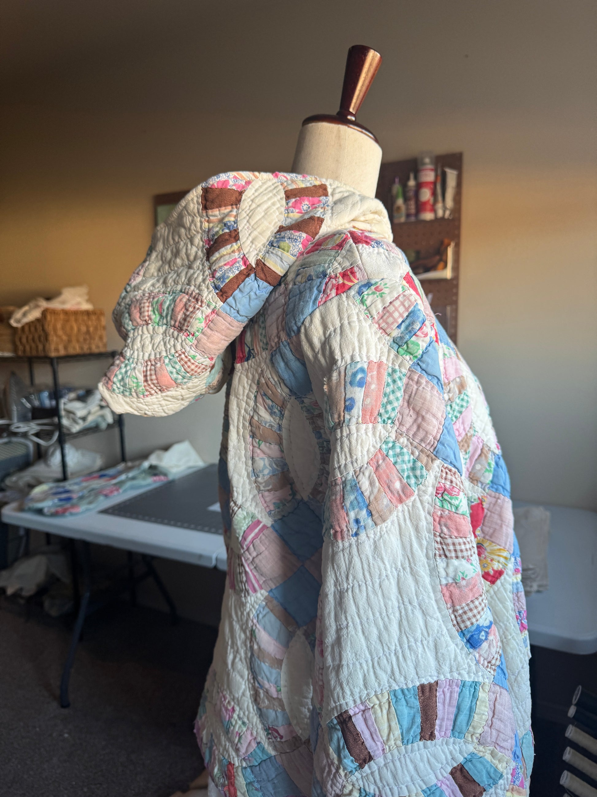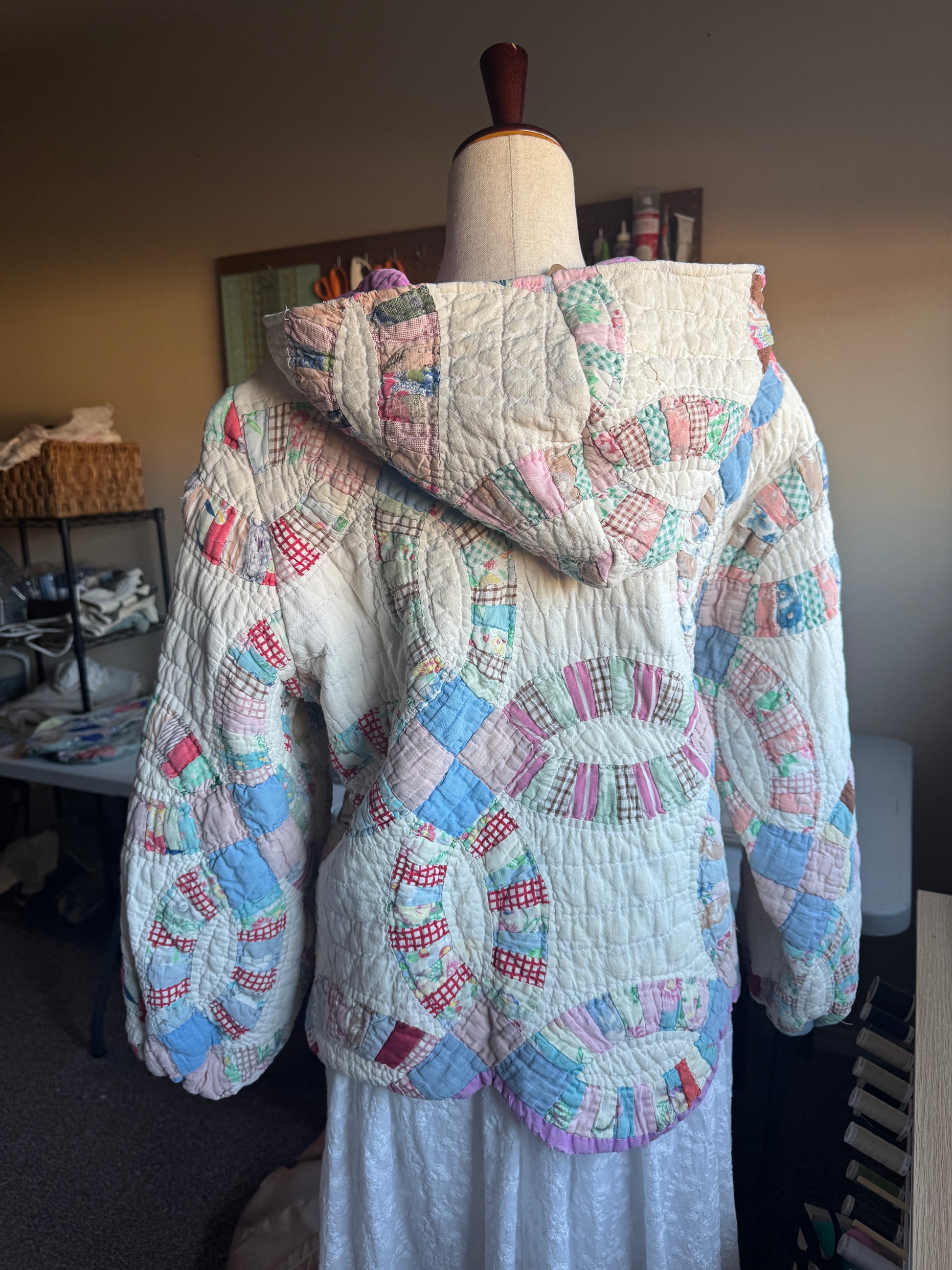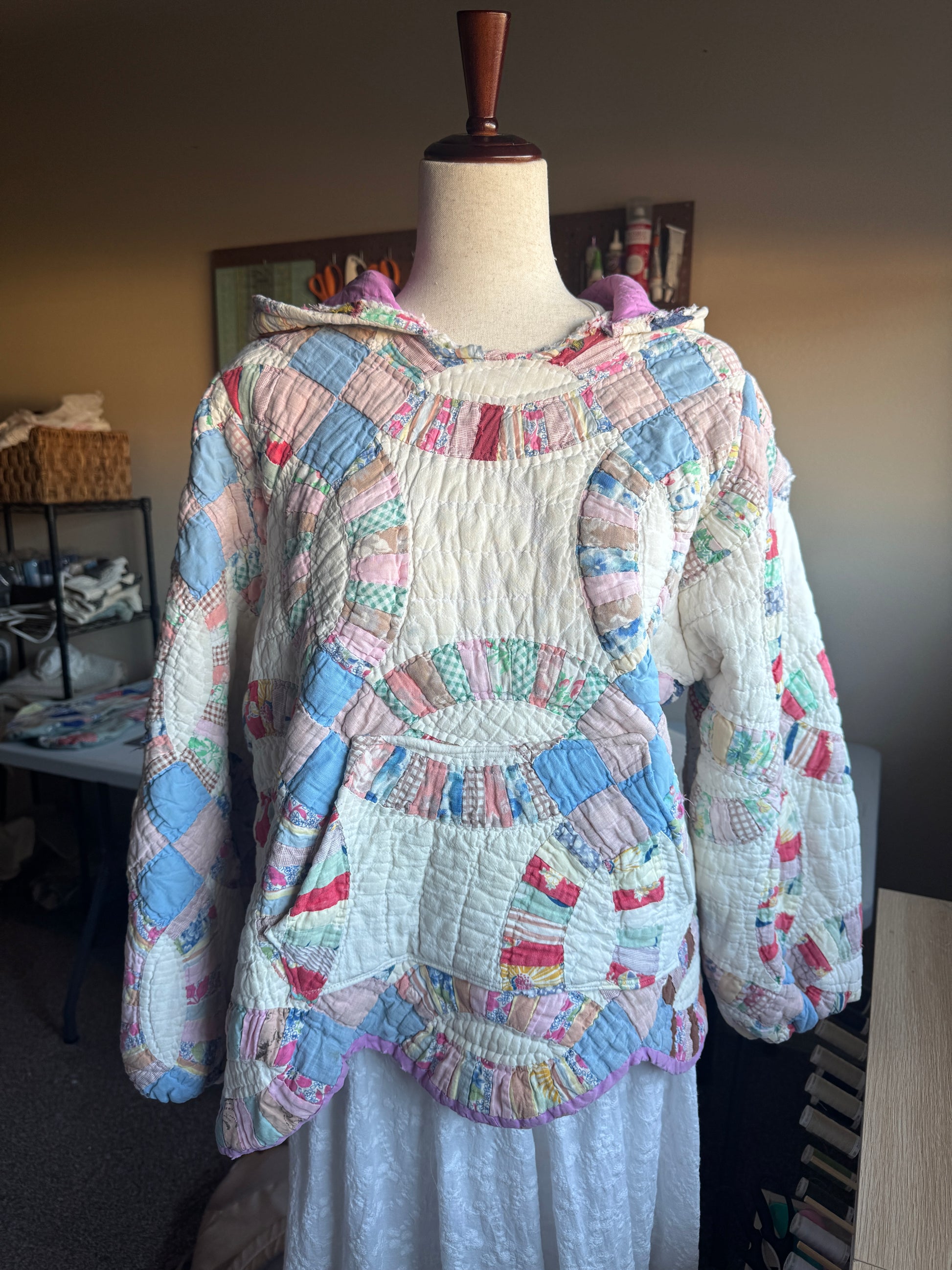 Simply obsessed. This hoodie has incredible colors from a found double wedding ring quilt!! Features an oversized hood, bishop sleeves (cinched), a front pocket and a scalloped bottom from the original edging of the quilt.