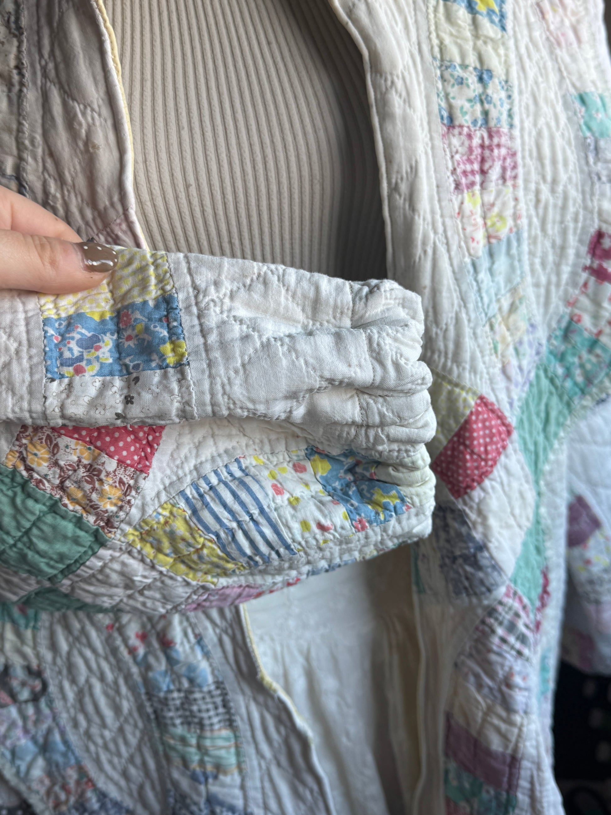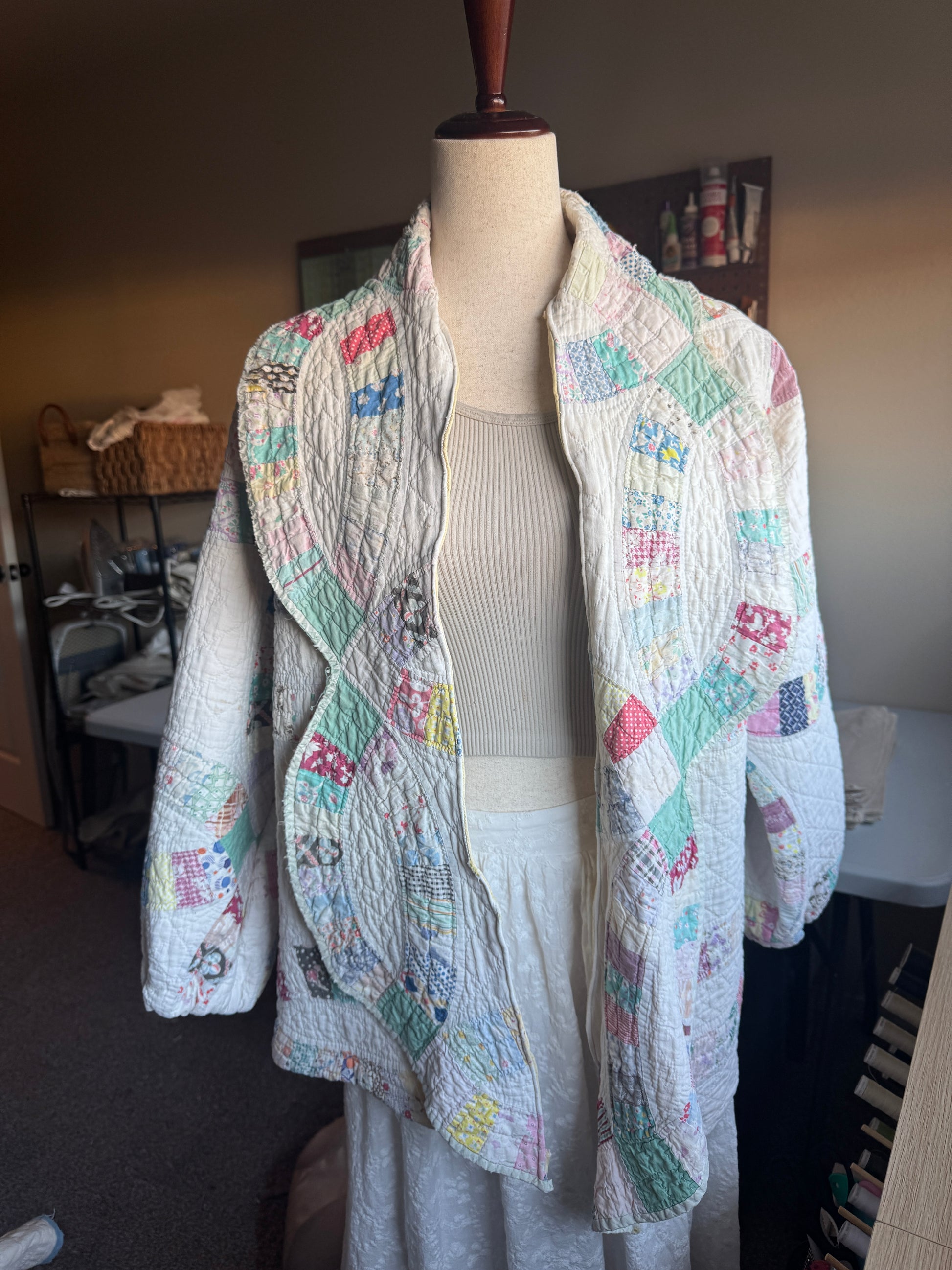 My favorite collection- the Faye coat! Nana's full name was Loretta Faye, so it's only fitting to have a style of a pattern I created named after her!! This jacket features an amazing lapel with the original trim of the quilt, and bishop sleeves (cinched). The butter yellow interior is beautiful!! This is a midweight coat :)
